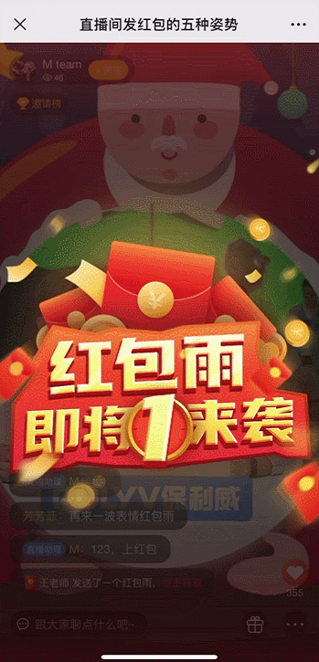 功能介绍:红包雨是直播间中活跃气氛一大利器,可以明显提高用户在直播间中的活跃度和参与度。在后台开启红包雨功能后,主办方一发红包,观众屏幕会出现漫天的红包,在15秒内,观众可以点击屏幕抢红包。