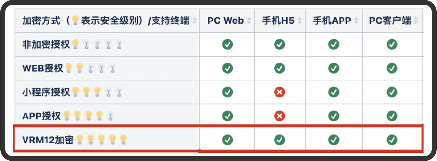 相较于主流的加密方式,VRM12播放器针对微信浏览器进行全面加密提升: