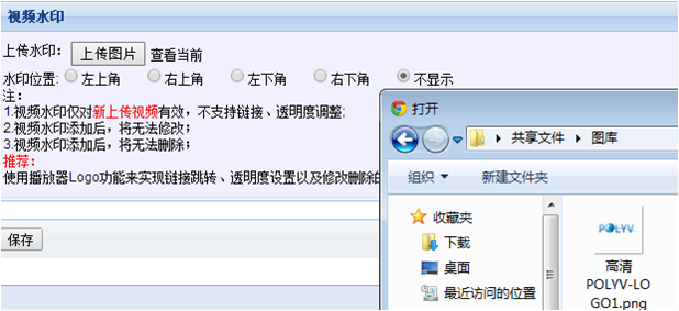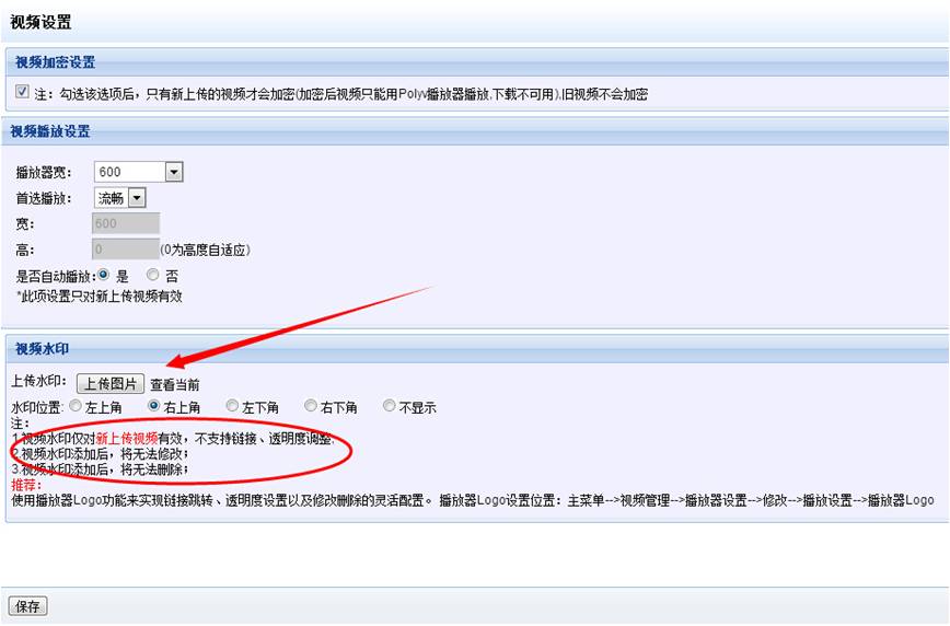 3、 水印效果:视频水印仅对新上传视频有效,已添加水印的视频不能更改,只能删除后重新上传方可。