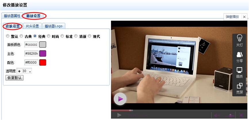 — 点击修改已有播放器(或添加) — 点击播放设置 — 皮肤设置,界面如下图: