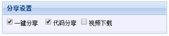 设置播放器是否提供用户“一键分享”(将视频分享到 微博,微信,人人网等SNS平台)、“代码分享”(视频转贴)和视频下载的功能。