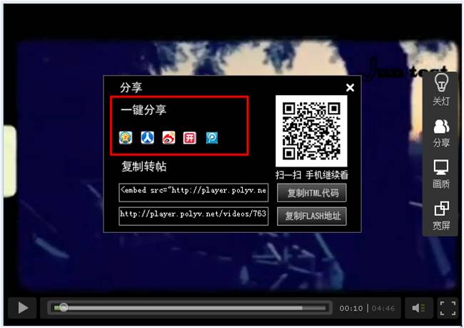 视频播放时,点击右侧菜单的“分享”,效果如下图: