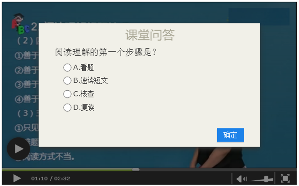 时间:在您所需要您的用户进行问题的回答处,获取时间点,但视频播放到您所设置的时间点时,视频会自动弹出您的问题。