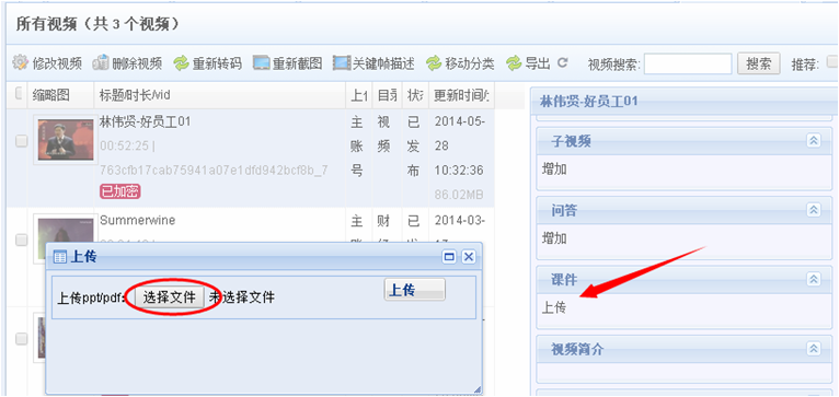 ) — 选中视频 — 右边菜单找到“课件” — 点击“上传”,选择你的课件PPT上传。