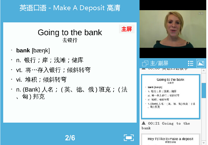 4 、主/副屏切换:可任意把视频/课件切换到主屏播放。