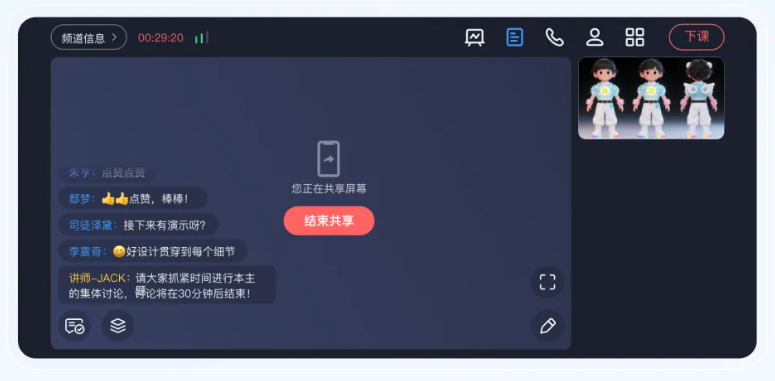 核心功能搭配:三分屏+签到+分组研讨+回放+学员行为统计;