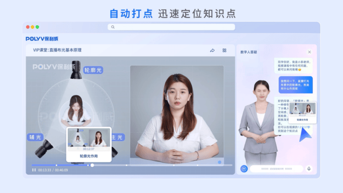 保利威AI能力贯穿企业培训“产-学-练-考-评”全流程。针对企业培训内容生产效率低、师资稀缺与更新缓慢三大痛点,保利威自2023年即推出POLYVAI系列产品,以AI数字人智能制课为核心,实现从内容理解、生成到呈现的全流程智能化。2025年全线AI产品接入DeepSeek后,进一步拓展了数字人定制、智能剪辑、AI助教等多样化能力,为众多大型国企提供高效、智能的“AI+视频”制课服务,显著提升产品宣讲、操作指引等场景的视频制作效率。