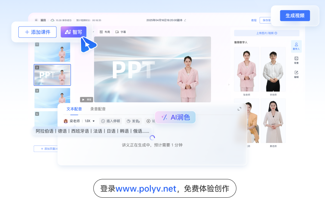 ·智能制课:讲师只需上传一份PPT,AI将自动撰写与PPT匹配的讲稿,并可选择1:1还原本人形象和声音的AI数字人分身出镜讲解。课程制作步骤被简化至三步。某金融机构拥有遍布全国的分支机构和超过10万名员工,采用保利威AI数字人智能制课解决方案后,实现了培训内容的快速更新和个性化定制,每月新增培训课程从20门增至200门,员工培训覆盖率从60%提升至95%。