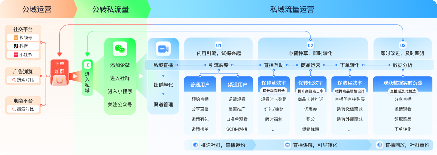·多渠道引流聚合:公众号菜单栏可嵌入直播间,企业微信一键转发,小程序内搭建直播聚合页,集中引入多渠道流量;