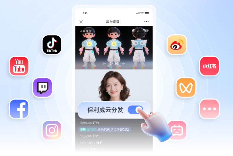 ·一键同步多平台:支持将小程序直播间内容,一键分发至抖音、B 站、YouTubeTikTok200 +海内外平台,1-3秒即可完成配置,无需额外操作,快速触达公域流量池;