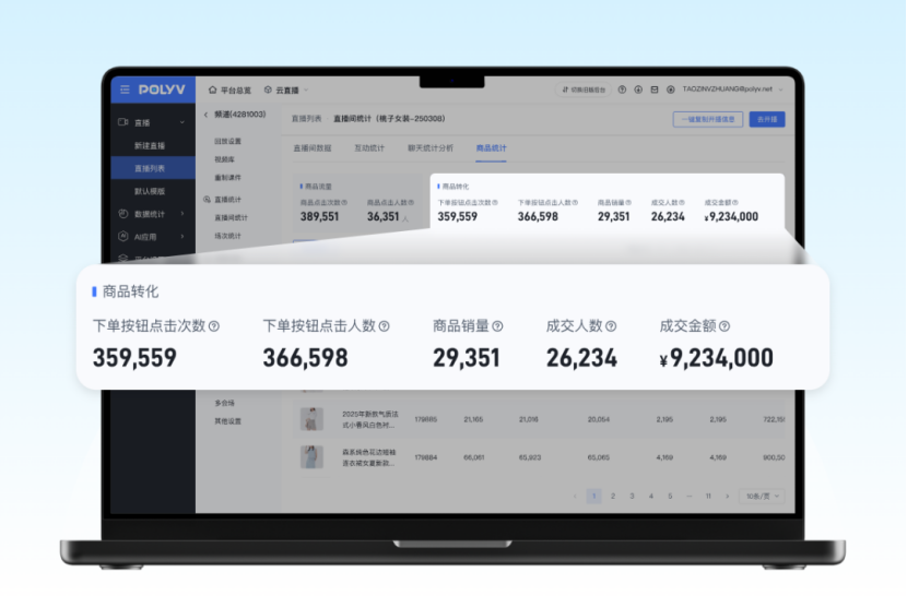 商品卡片+一键下单:支持商品卡片实时推送、优惠券即时发放,用户点击商品即可跳转至微信小程序、景区官网或第三方商城完成购买。相比传统“看直播→退出一搜店→下单”的复杂链路,保利威方案将成交路径压缩至最小化。