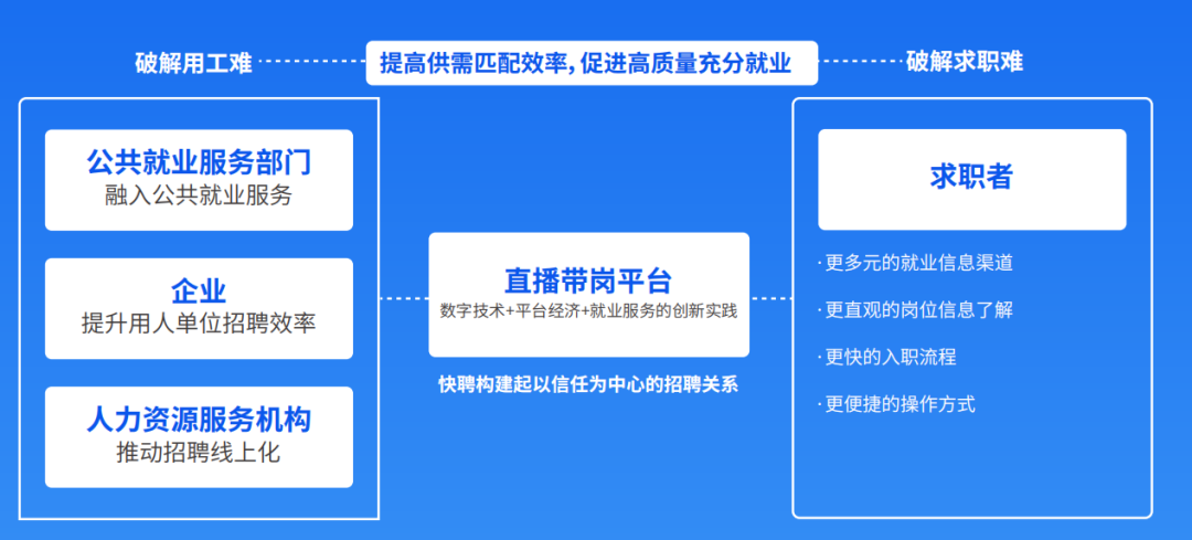 现在,“直播带岗”的数字化招聘模式正在打破传统的招聘市场的供需失衡、信息不对等的困境,正被越来越多的政企事业单位、大型制造业企业所采纳,并且摸索出了一套政府、企业、平台三方协同的高效运转机制。
