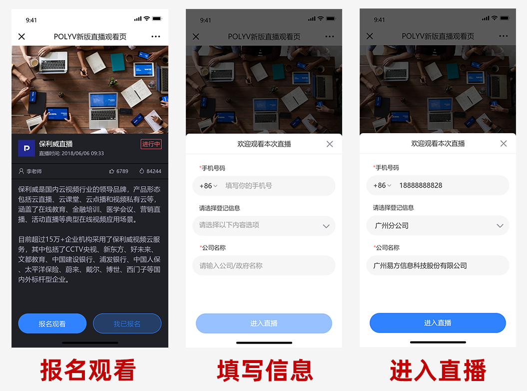 4)支持设置多种观看条件:企业在配置线上直播间时,可以设置多种观看条件,例如公开观看、白名单授权、密码观看、登记观看等,可以对进入直播间的用户登记联系方式、名字、学校等信息,方便筛选人才。
