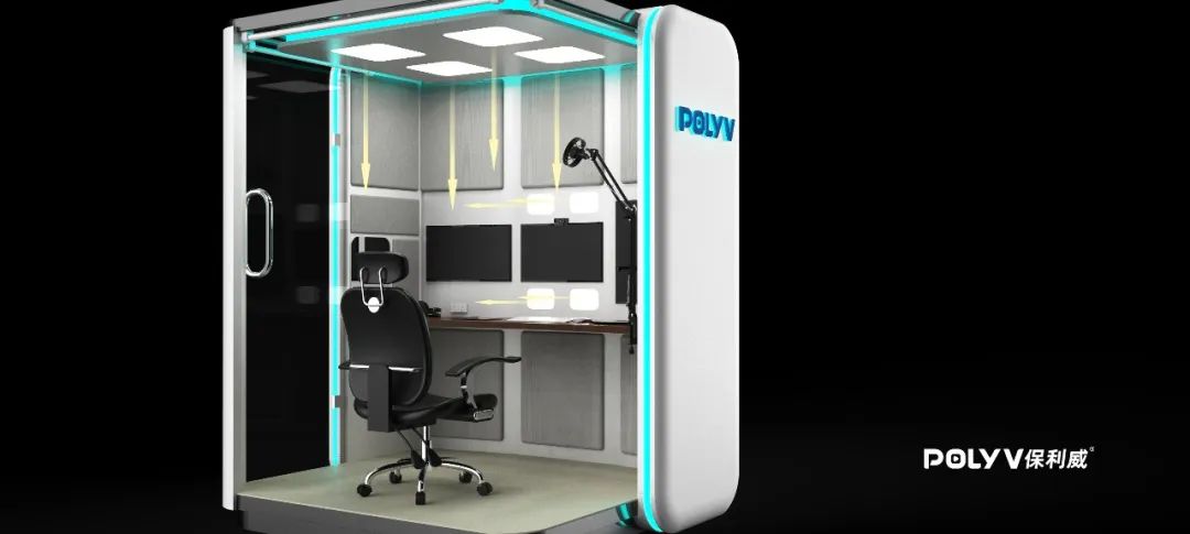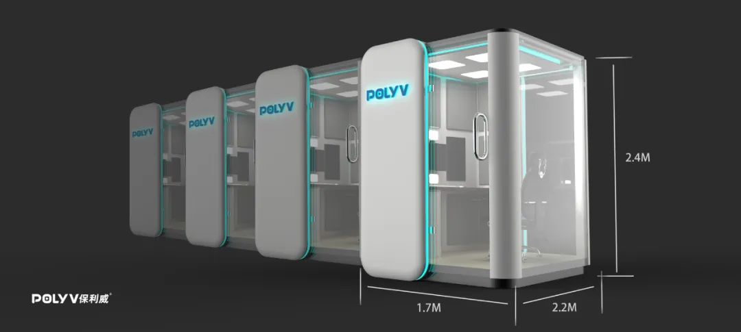 (1)一体化箱体结构:整个直播舱是封闭型的箱体结构,长2.2米、宽1.7米、高2.4米,占地仅3.74平方米,一个普通会议室就可以同时安装多个直播舱,满足高密度部署、多人同时直播,单舱即可容纳两人进入。舱体由顶级钢材搭建,防水、防锈,自带负重轮,可灵活安装、便捷移动。舱体外观也支持品牌专属定制,设计为品牌LOGO或VI。