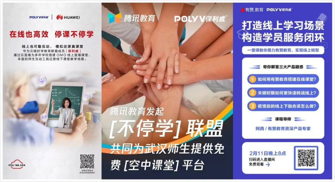 保利威加入【华为云随时学教育联盟】、【腾讯教育不停学联盟】、【郎培教育集团打赢疫情战公益联盟】……助力在校师生、线下机构转向在线授课。与有赞在疫情爆发第一时间建立联系,联合推出暖心活动“停课不停学”,用科技为教育赋能。