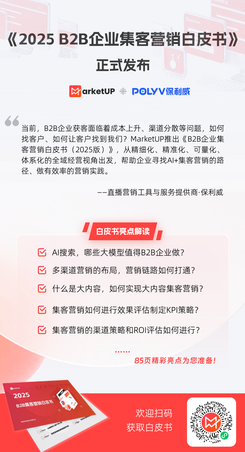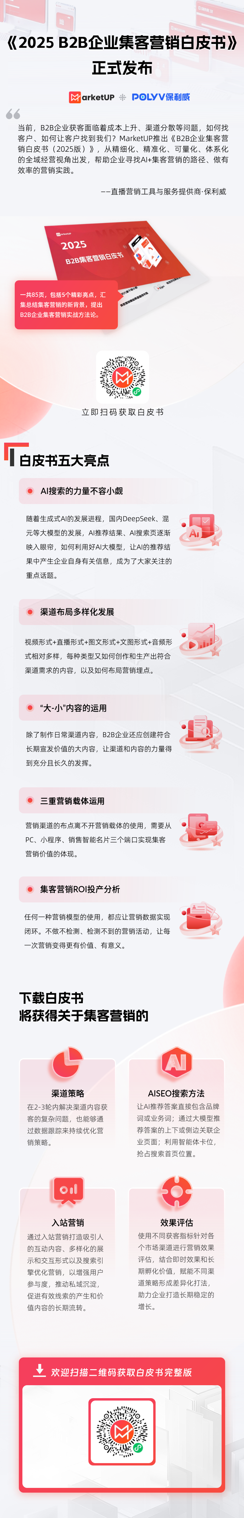 MarketUP推出《B2B企业集客营销白皮书(2025版)》,从精细化、精准化、可量化、体系化的全域经营视角出发,帮助企业寻找AI+集客营销的路径、做有效率的营销实践。