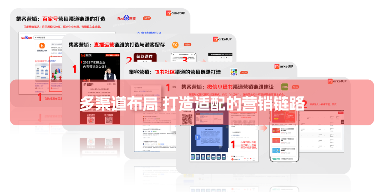 对于这次的获客链路,除了过往微信公众号、官网、百家号、知乎外,我们还另外补充了基于2024-2025年MarketUP市场团队的渠道心得,其中涉及到: