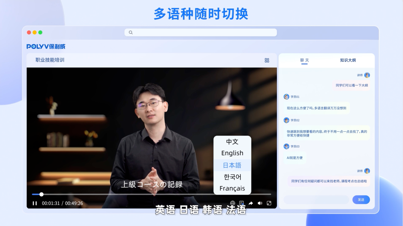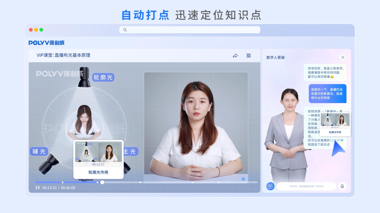 如何突破困境?周鑫分享了某国际化妆品集团的案例。2023年,该集团每月举办超过100场直播培训,但平均时长只有17分钟,完课率仅31%。通过“1+N+X”的视频直播学习模式,该集团企业培训直播的平均学习时长提升至31分钟,知识应用率达73%,完播率达56%。有哪些超级工具?基于降本增效的考量,保利威推出了AI直播快剪、AI多语言翻译、AI数字导师三款新品,帮助企业机构的组织学习实现智能化升级、场景化突破、生态化整合。