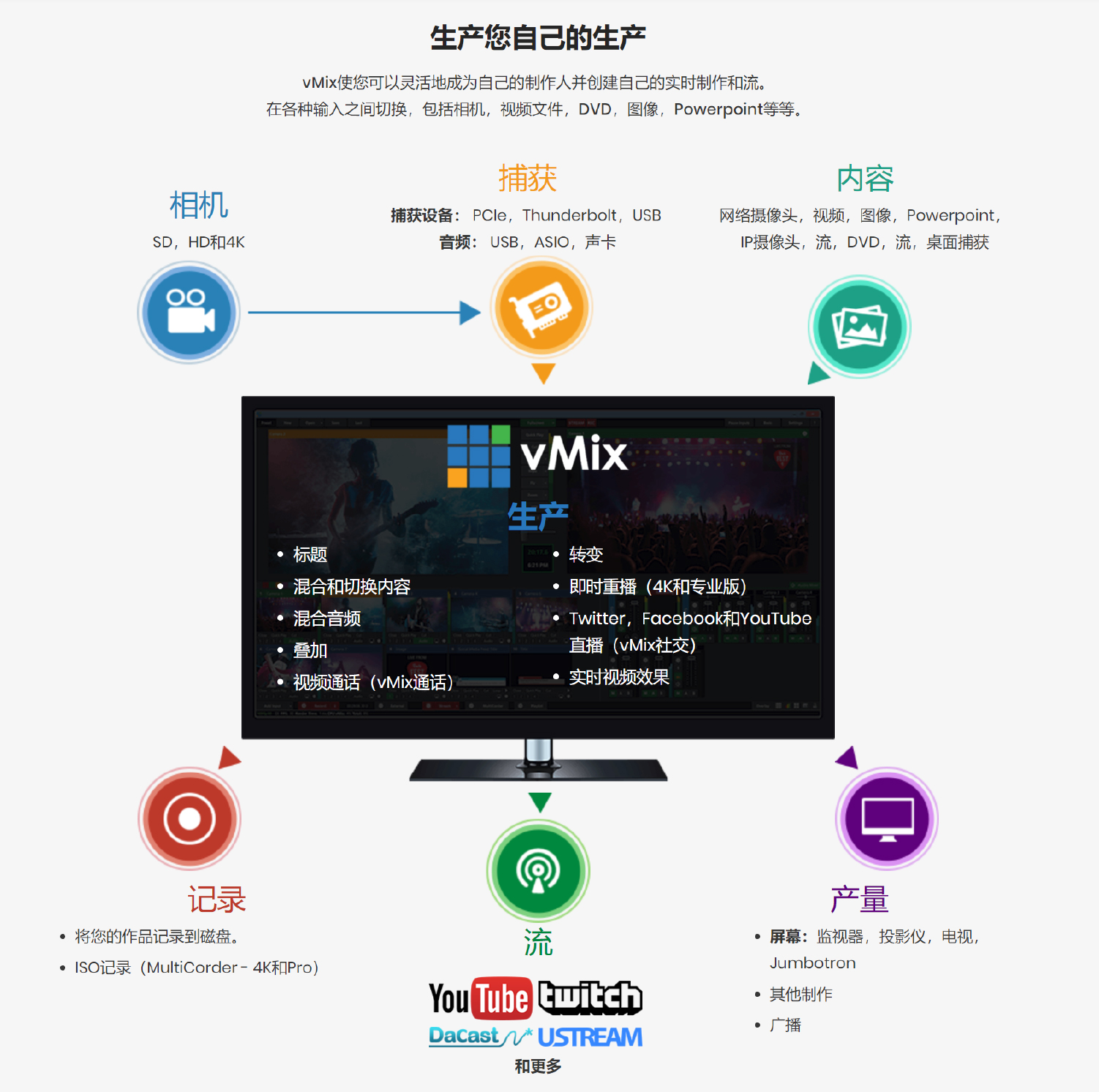vMix是一款将传统广电硬件切换台、字幕机、流媒体编码器功能深度集成于一体的Windows软件。它支持多路摄像机输入、虚拟演播室、动态图文包装、即时慢动作回放等广电级功能。
