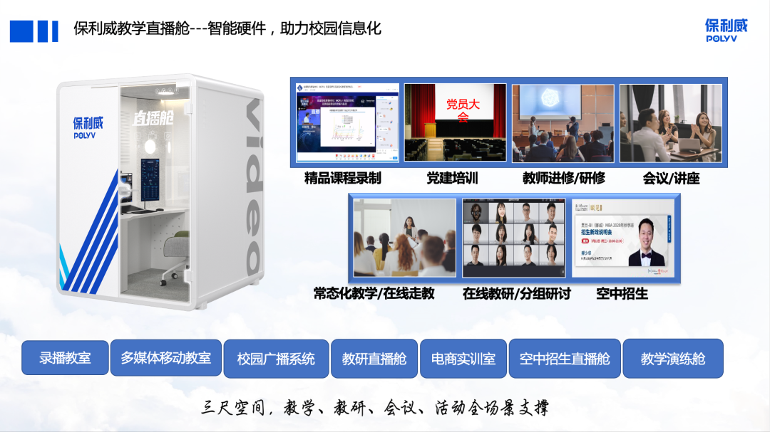 “立方寸之地,助教学无境,授锦囊运营”。目前,保利威直播舱已走进南京理工大学、华南师范大学经管学院、广东轻工职业技术学院、浙江嘉兴职业技术学院、嘉兴大学、武汉国家开放大学等院校,并为某市级教育局、各企业提供直播舱技术服务。