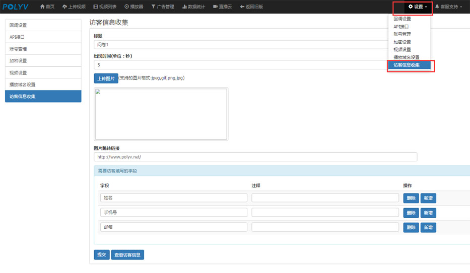 在注册保利威视之后,到后台点击菜单栏右边“设置”按钮,点击“访客信息收集”,如下图: