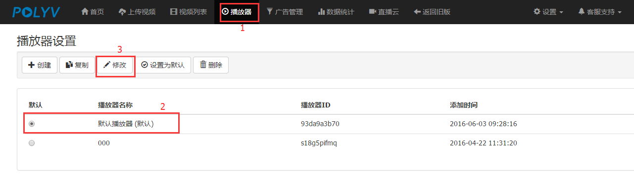 1.登录保利威视账号后,点击【云点播】进入点播后台,然后点击菜单栏上的【播放器】,选择已有播放器(或创建新的播放器)—点击“修改”,界面如下图:
