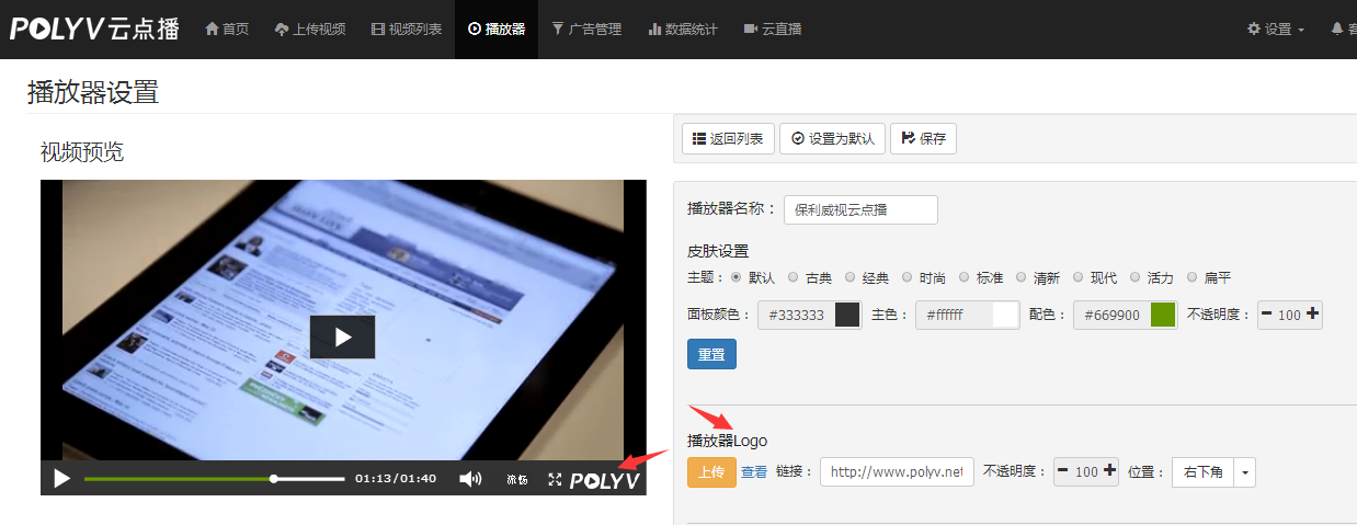 2.点击“修改”后,进入播放器设置界面,找到【播放器Logo】,点击“上传”,进行相关设置,如下图所示: