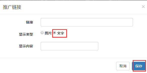 2.点击【推广链接】后,进入如下图界面,其中“链接”填写点击文字所跳转到的地址,“显示类型”选择“文字”,“显示内容”编辑所显示的文字内容。编辑完成点击【保存】即可。