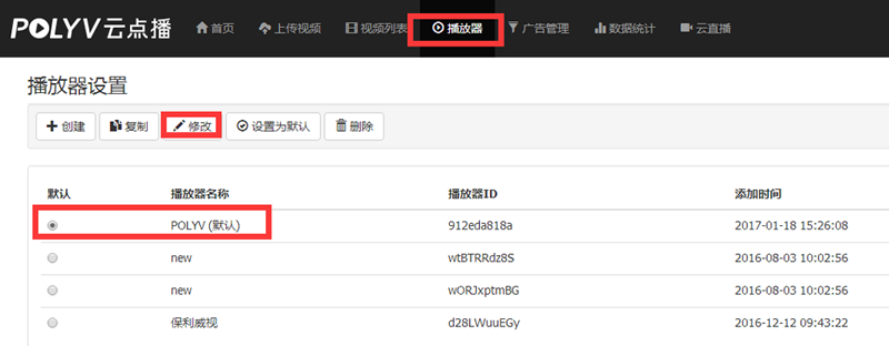 1.在进入保利威视的后台后,点击顶部功能列表的【播放器】,选择已有播放器(或创建新的播放器),点击【修改】,如下图: