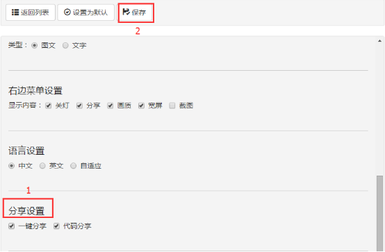 2.点击【修改】后进入如下图界面,找到【分享设置】。当设置播放器提供用户【一键分享】时,可以将视频分享到QQ空间、人人网、新浪微博,当选择【代码分享】时可进行复制转贴。