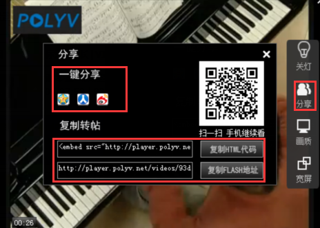 3.视频播放时,点击右侧菜单的【分享】,效果如下图: