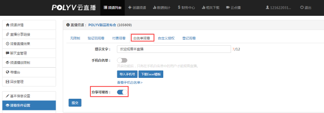 (2)点击【付费观看】/【白名单观看】/【登记观看】,打开【分享可观看】开关,提交即可,如下图:
