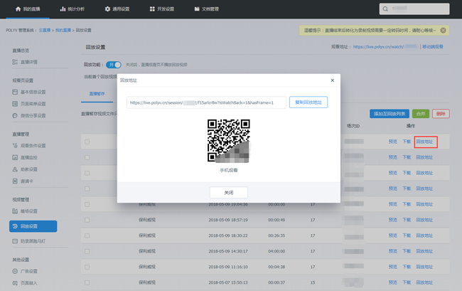 2、后台自动生成单场直播回放的三分屏链接,方便用户嵌入自己的页面。