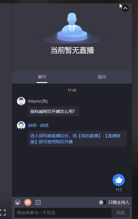 在保利威直播后台开启新版观看页后,用户进入直播间后观看页面效果如下: