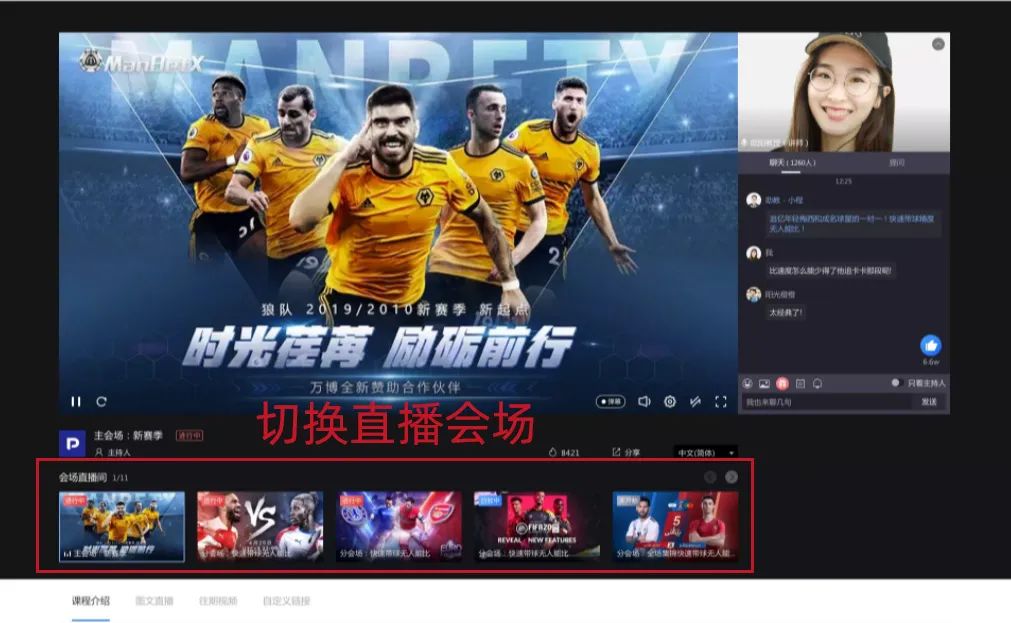目前新版观看页已经上线多会场直播,观众点击主画面下方即可进入不同的会场。