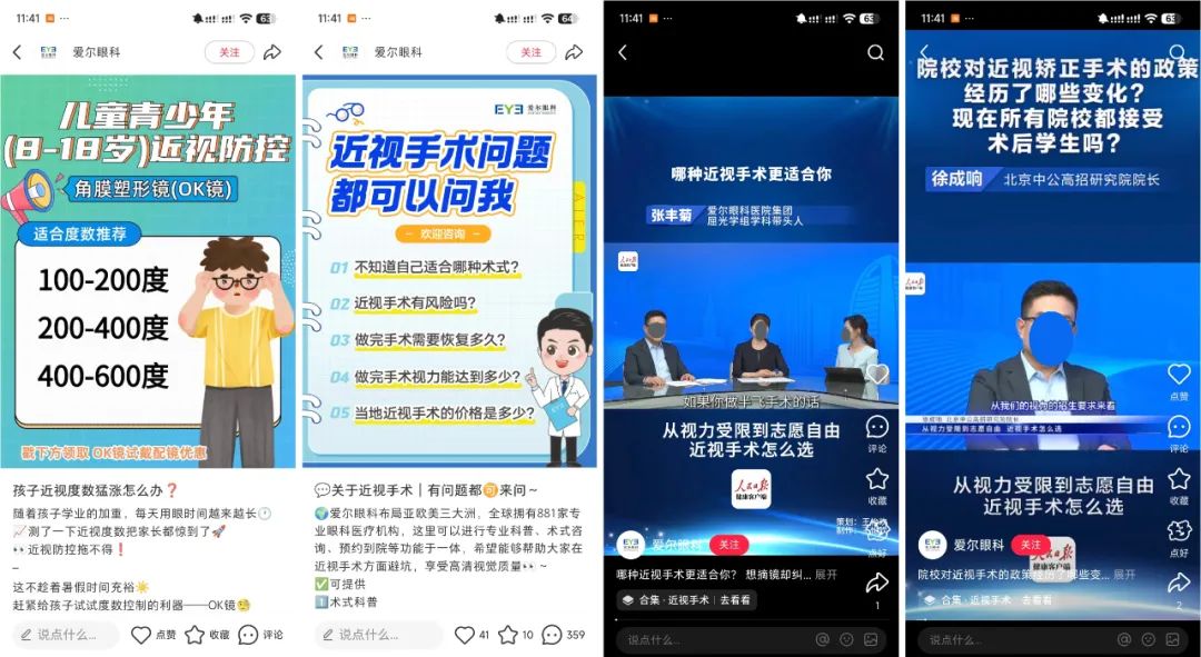 在小红书抖音等平台,爱尔眼科推出《必看的近视手术指南》等内容栏目,邀请名师专家对近视矫正手术进行科普讲解,通过短视频+直播的形式双线种草;在权威平台,爱尔眼科医生出席人民日报健康客户端等直播栏目,围绕“高考生视力检查”等热门主题进行科普,增强品牌可信度。