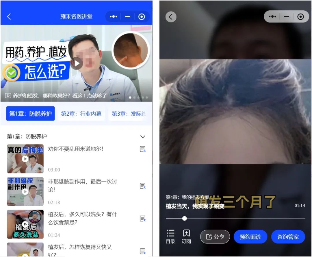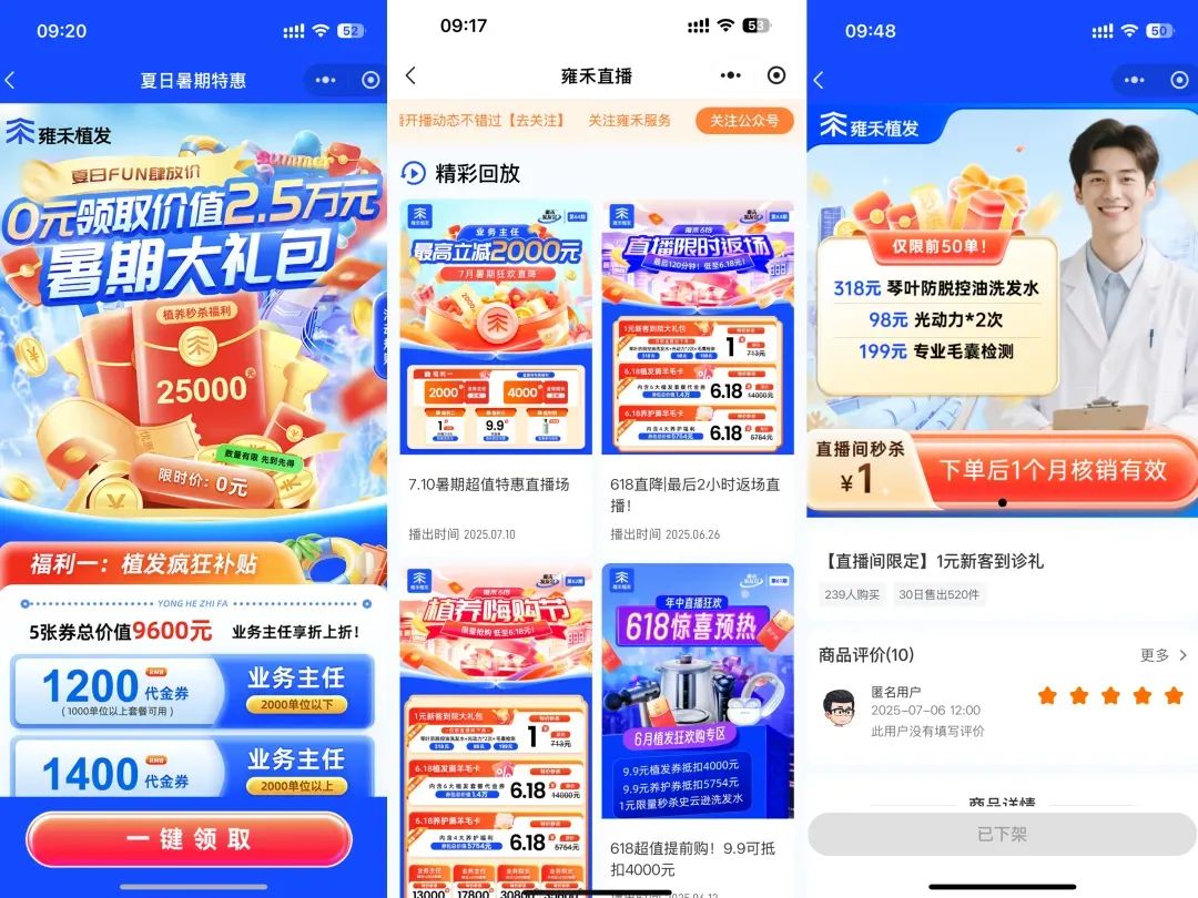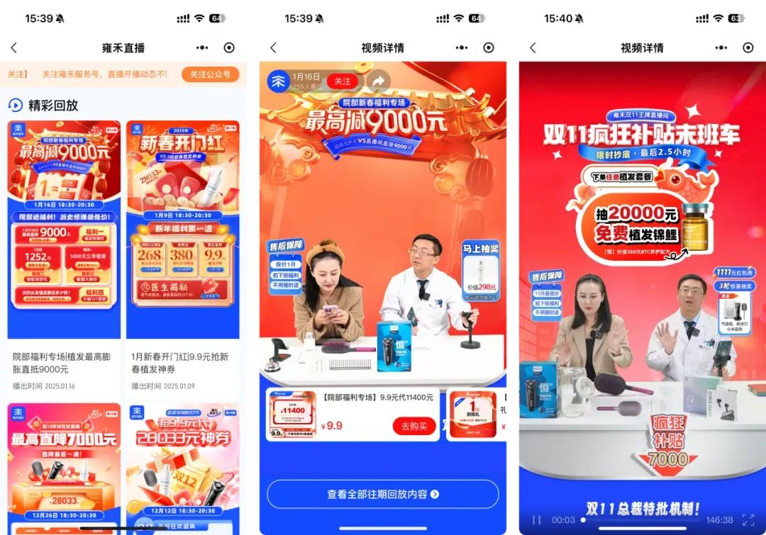 以雍禾植发为例,2024年雍禾植发旗下的微信小程序“雍禾毛发健康”上线了全新的直播间,该直播间由雍禾品牌方直属管理,主要用于微信生态内的营销与转化。过去几年,得益于各地门店的新设与线上营销推广等动作,雍禾植发的微信私域积累了一定体量的潜在客户,在小程序直播的形式下,雍禾植发推出各类带货直播,利用优惠券、限时开价等活动吸引私域客户参与。