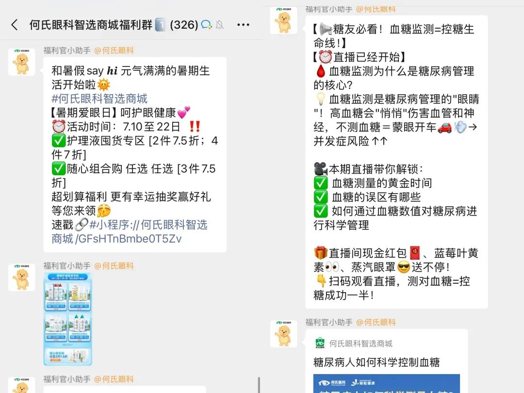 在直播内容设计方面,何氏眼科并非只提供眼科相关主题,也会联动其他医疗服务品牌做健康主题直播,如邀请营养专家讲解如何预防/缓解糖尿病并发症等,以丰富小程序商城的直播主题,给私域用户更多元的内容服务。