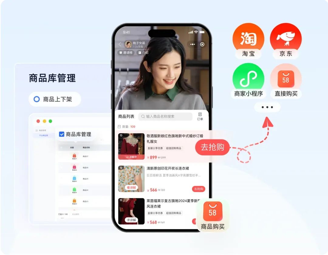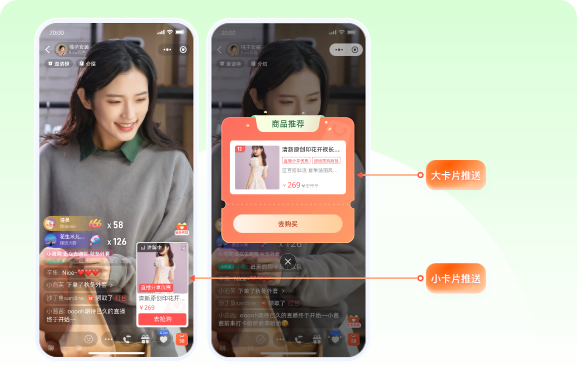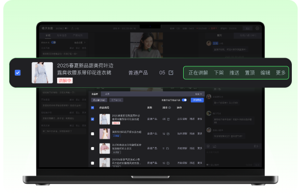 为了更好地支持商品转化,直播间也提供根据商品卡片推送、商品讲解回放、商品置顶、商品标签与排序等商品展示的能力,帮助企业将商品更流畅地推送给观众。