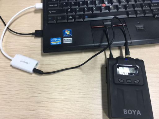 1.接线。在小蜜蜂发射端,找到麦克风的标志,将麦连接到小蜜蜂的发射端。接收端连接3.5mm连接线,另一端接到电脑声卡的麦克风输入;