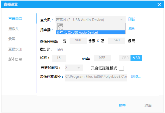 4.登陆POLYV直播客户端,点击设备调试,在麦克风源处选择刚才记录下来的声卡名称,如果小蜜蜂是默认录音设备,选择默认,点击确认即可;