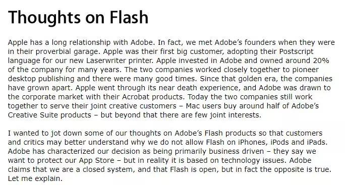 用户发现iOS和Flash播放器不兼容,而且乔帮主认为Flash不开放、性能差、漏洞多、还不适配触摸屏。他认为,HTML5应该成为移动端的标准。