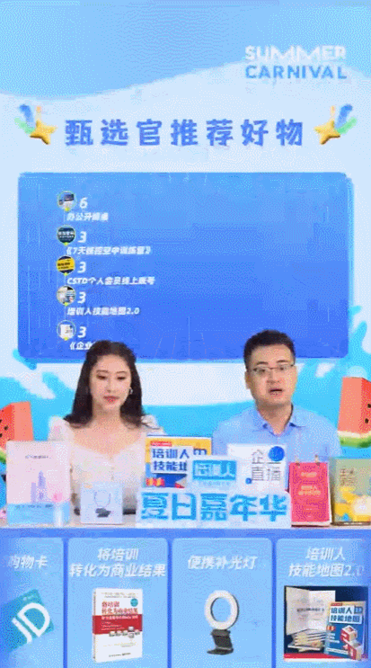 直播的内容主题和画面布局,也为培训人夏日嘉年华添上了浓厚的【营销味】,数十位培训专家摇身一变成为「带货主播」,让人仿佛来到了新东方董宇辉的直播间。