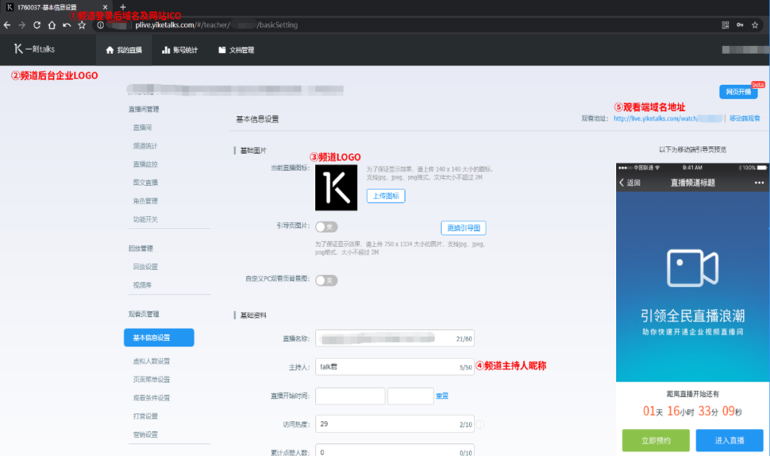 用户通过直播管理后台设置,可以对直播观看页进行个性化装修。观众进入直播间的第一眼,就是无处不在的品牌信息,更容易被感染和说服。