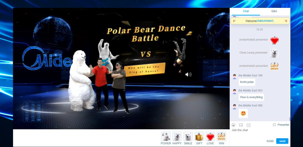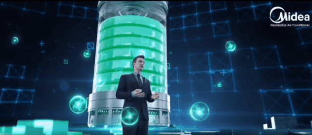 广交会上,美的举办了充满科技感的“智造未来”线上研讨会,直播舞台背景用3D动画打造,主持人巧妙融入虚拟背景中,科技范十足。