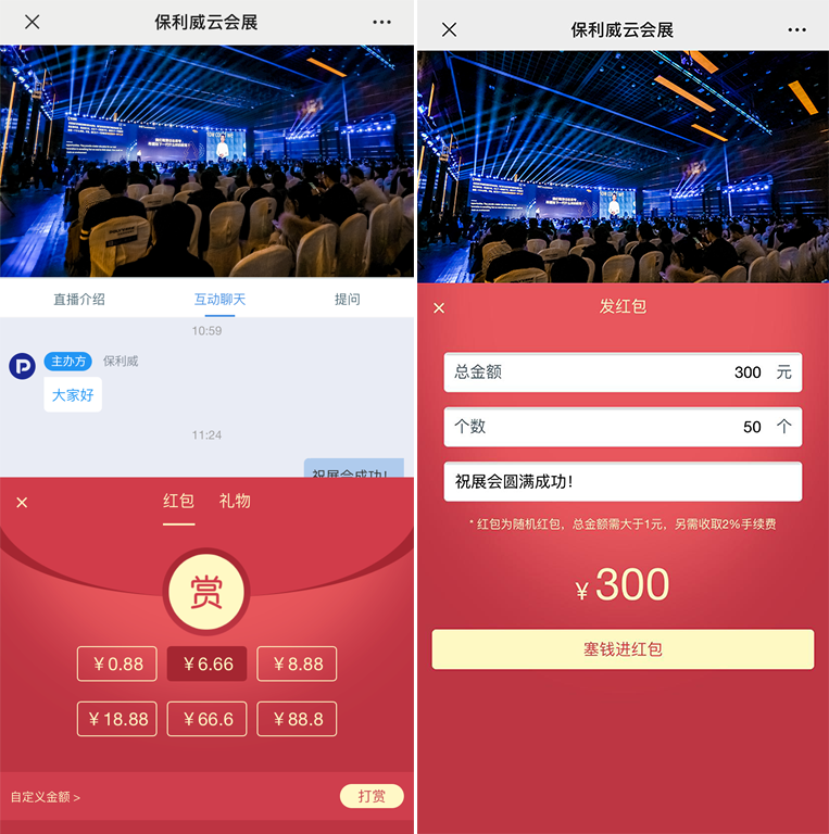 保利威支持红包打赏、抽奖、聊天弹幕等多种互动形式,能够帮助商家活跃展位,还原线下互动场景。