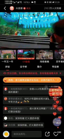 如果你通过「央视频」APP 观看,可以体验到「 VR 沉浸声」春晚直播,观众可以自由操控视频视角,听到来自身边所有方位的声音。视频与音频除了时间上的同步,还做到空间位置的同步,实现了现场级的超视听体验。