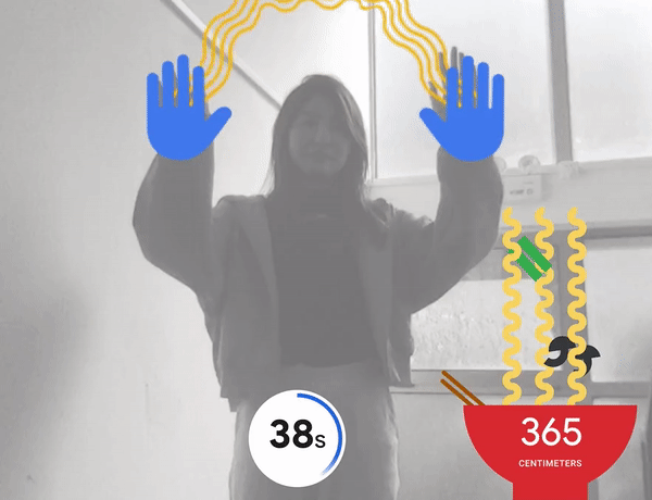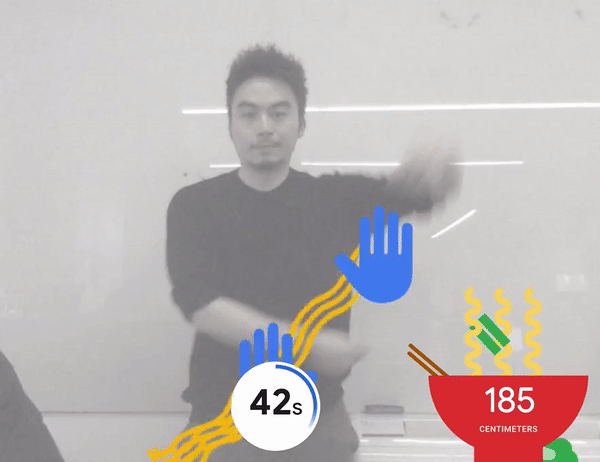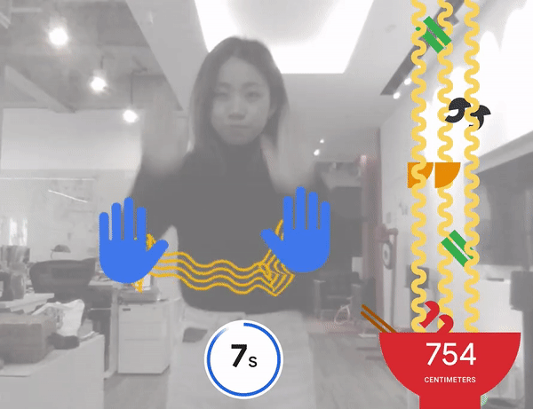 Google面馆作为大会上的趣味游戏,受到了各路好手的热捧。每局拉面限时 60 秒,玩家可以想象自己是拉面大师,通过活动手和上半身的动作配合来制作虚拟“面条”,比如尽可能地上下移动拉扯面条,也可以加速甩动表演酷炫拉面绝技。