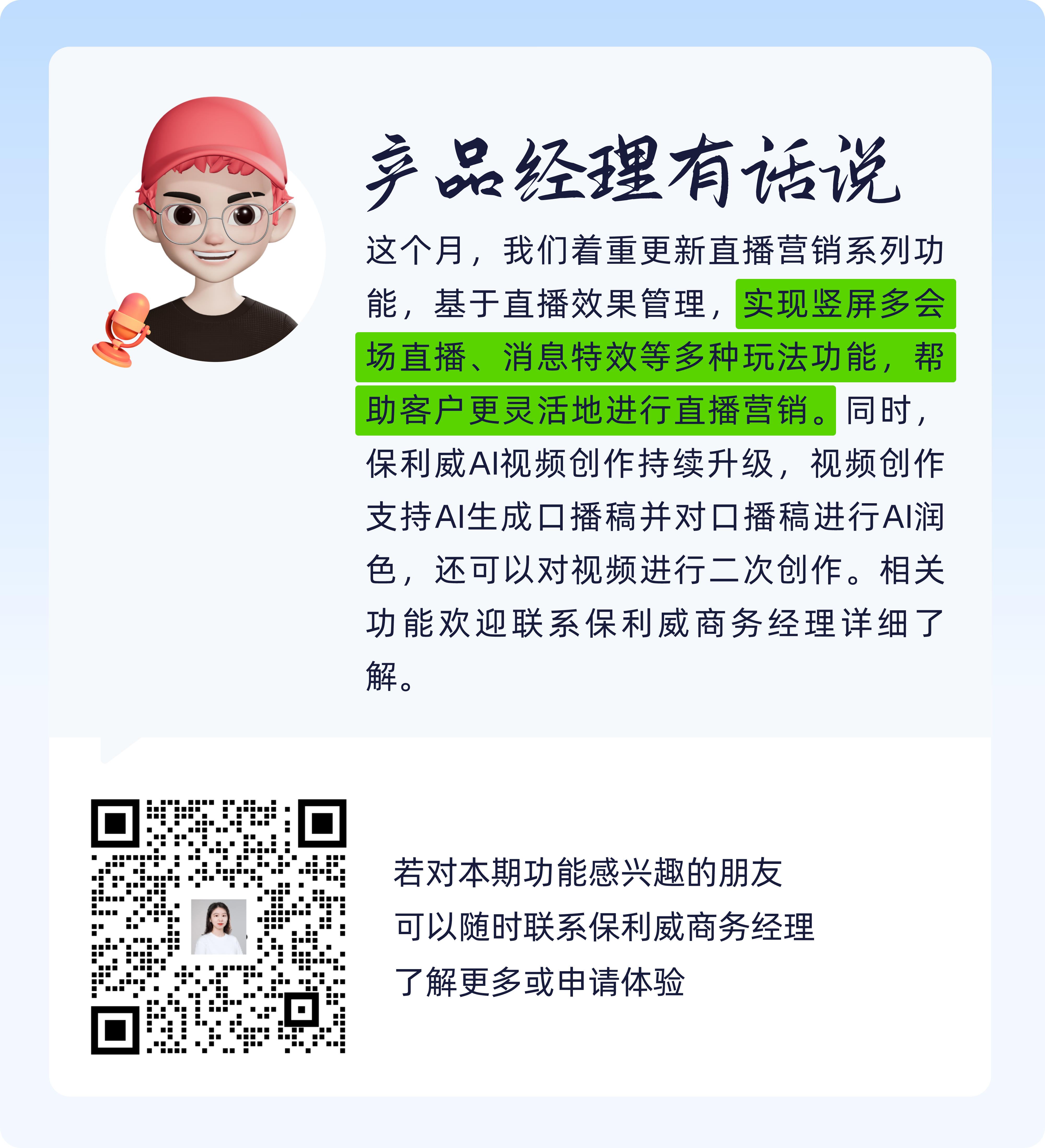 摘要: 这个月,我们着重更新直播营销系列功能,基于直播效果管理,实现竖屏多会场直播、消息特效等多种玩法功能,帮助客户更灵活地进行直播营销。同时,保利威AI视频创作持续升级,视频创作支持AI生成口播稿并对口播稿进行AI润色,还可以对视频进行二次创作。