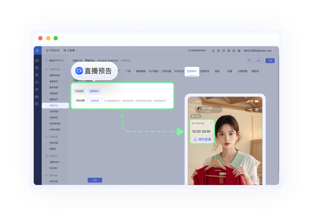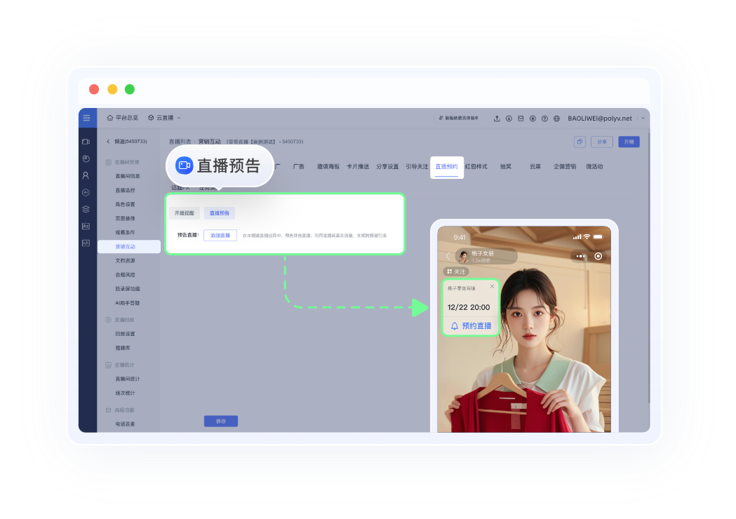 开启直播预告后,在本场直播过程中可展示其他直播频道的预约信息,帮助主播引导观众预约,实现跨频道引流。观众预约成功后,将在直播开始前收到开播提醒。